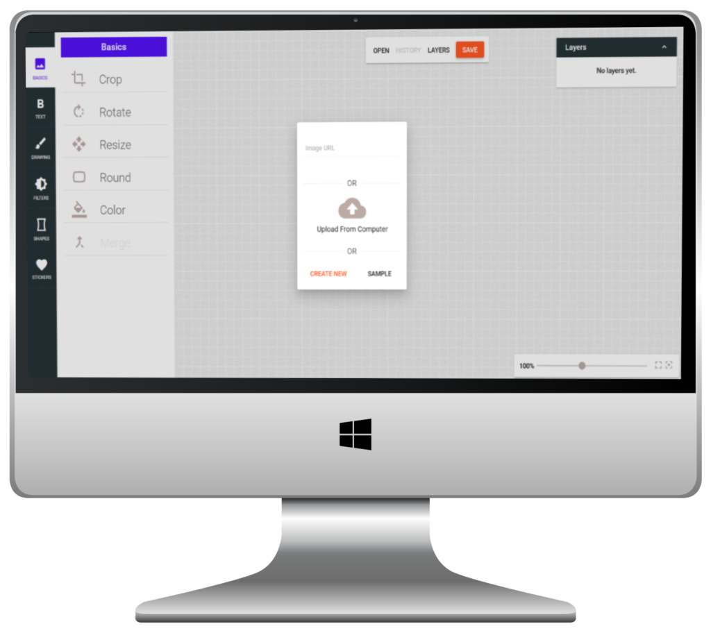 Clean, intuitive online image editor with a left sidebar for crop, rotate, resize, round, and color tools. Upload from computer or URL, create a new canvas, manage layers, and save instantly in a simple, distraction-free workspace.
