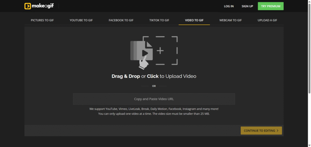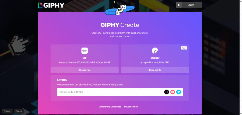 Giphy is the world’s largest GIF library, and its built-in GIF maker is excellent for quick conversions. You can upload videos directly or paste a YouTube link.